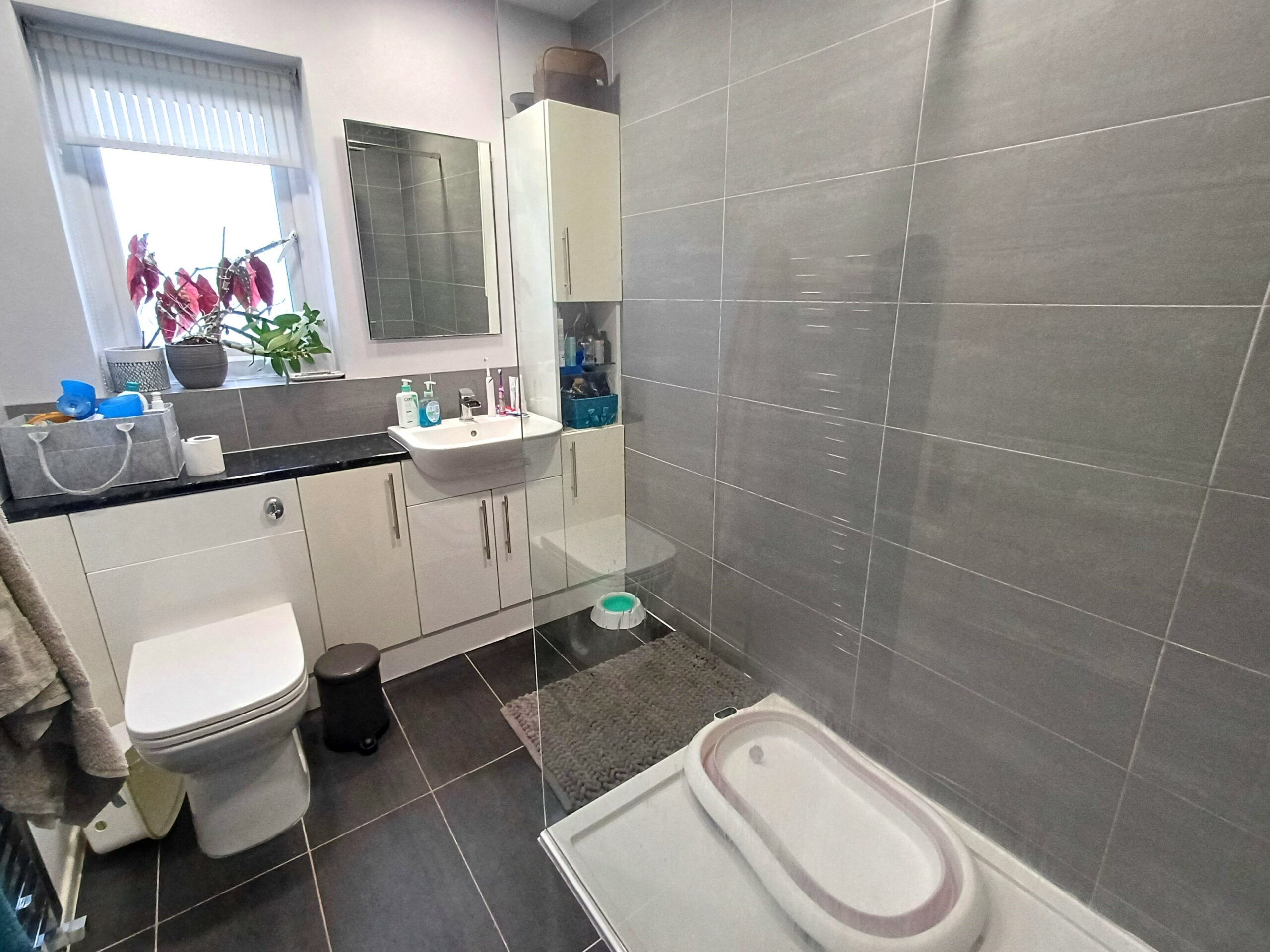 Low level WC, wash basin, walk in shower, tiled walls, spot lighting, towel radiator, window to side.