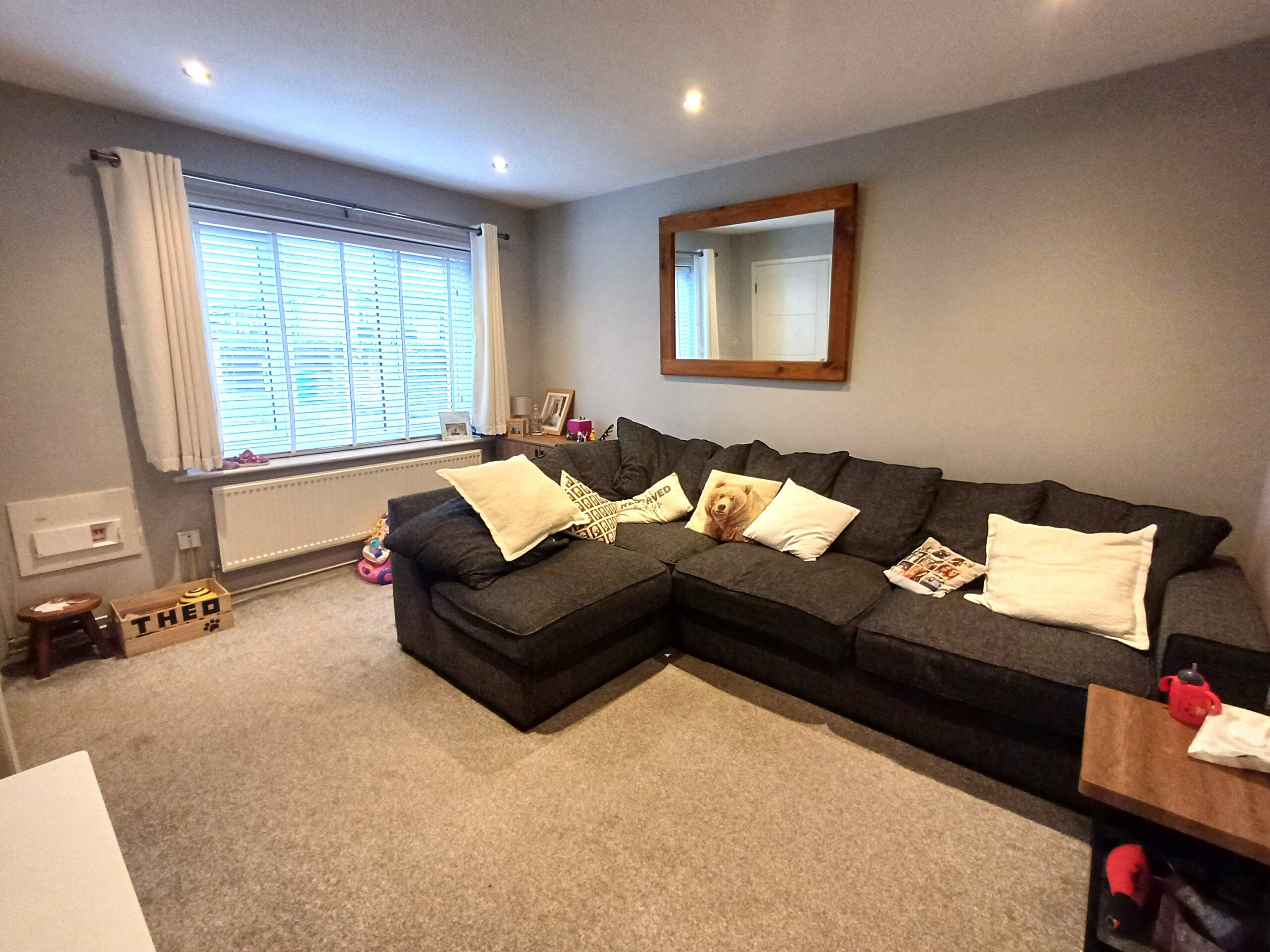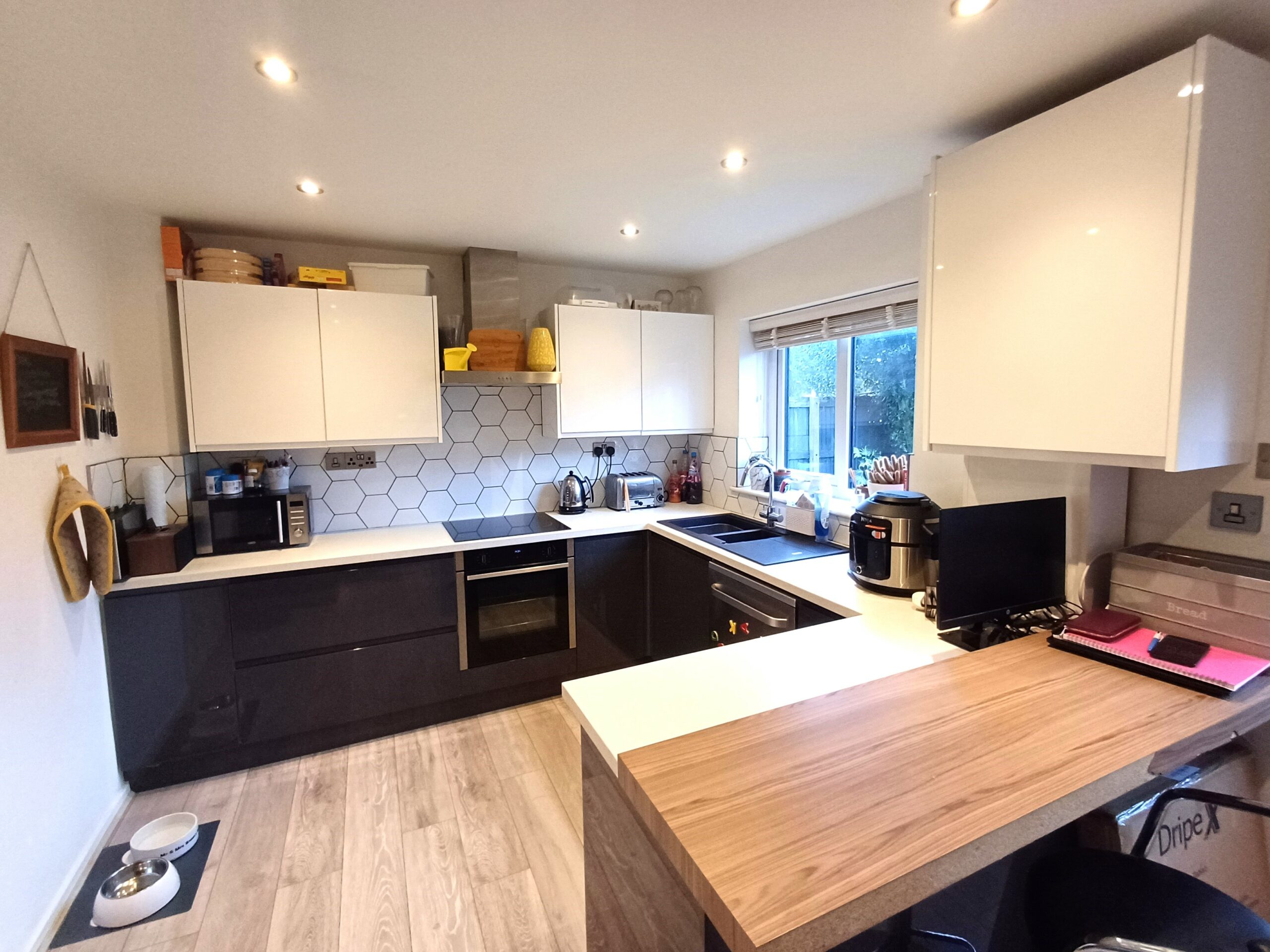Fitted with a range of units incorporating a sink and drainer, four ring induction hob with extractor over, oven, built in washing machine, space for dishwasher and fridge freezer, radiator, breakfast bar, spot lighting, storage cupboard, window to rear, door to rear garden.