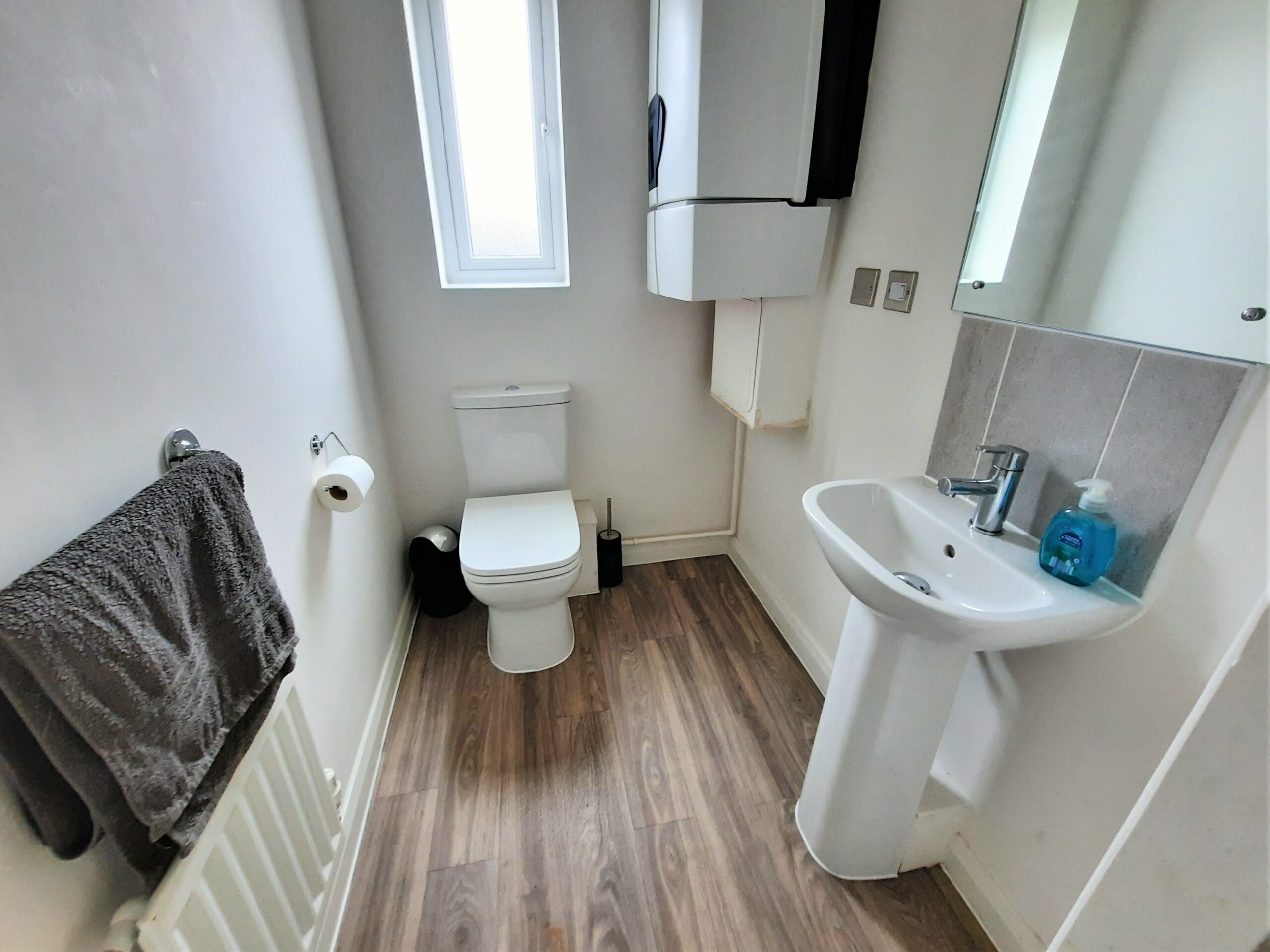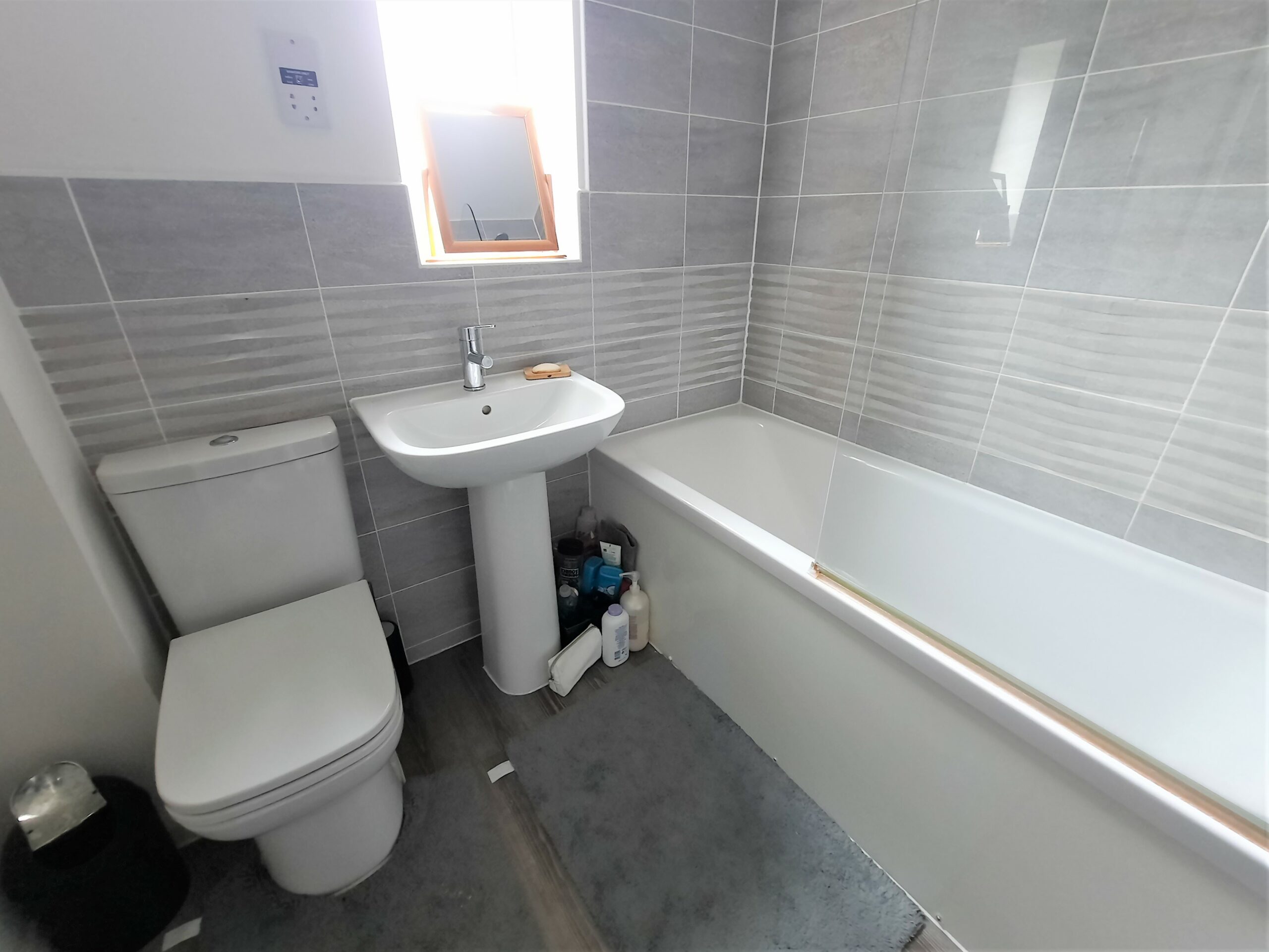 Suite comprises of a low level WC, wash basin, panelled bath with shower over, part tiled walls, towel radiator, spot lighting, window to front.