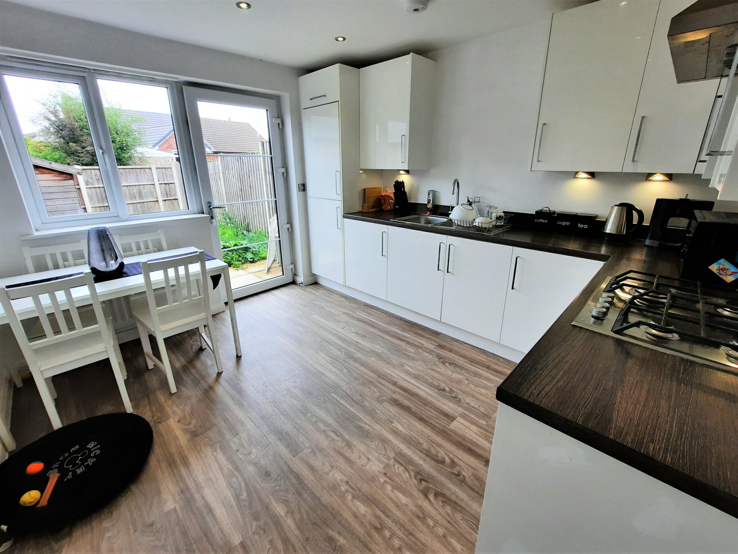 Fitted with a range of base and eye level units incorporating a sink and drainer, gas hob with extractor over, oven, built in fridge freezer, space for dining table and chairs, spot lighting, window to rear, door to garden.