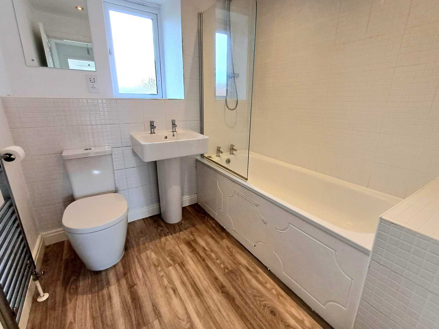 Low level WC, wash basin, panelled bath with shower over, part tiled walls, towel radiator, spot lighting, window to rear.