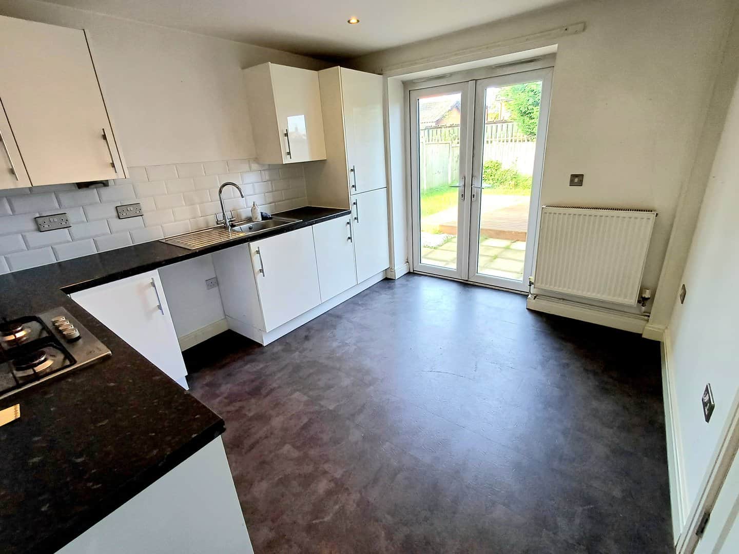 Range of base and eye level units incorporating a sink and drainer, gas hob with extractor rover, oven, built in fridge freezer, space for dishwasher, French doors to garden.