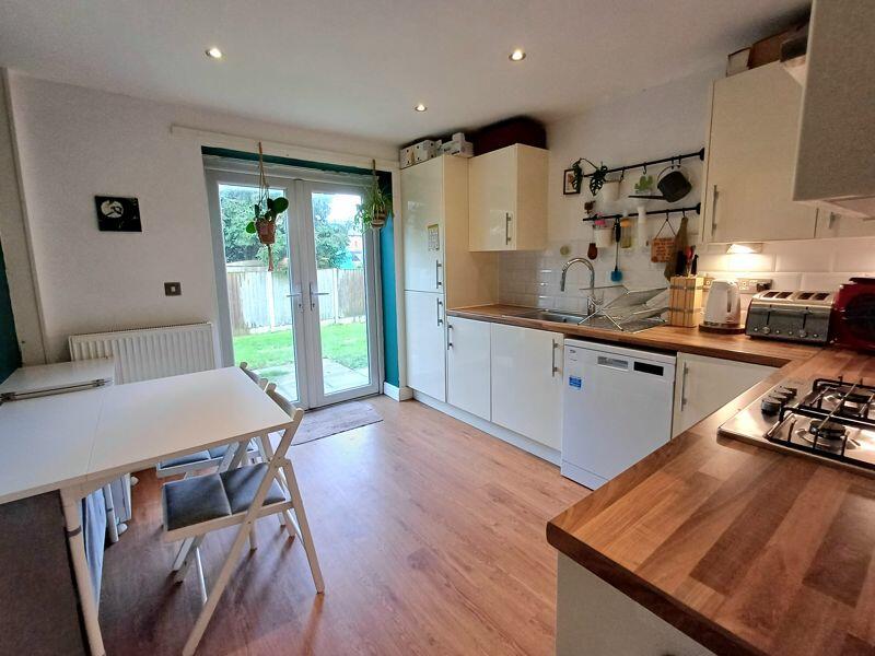 Range of base and eye level units incorporating a sink and drainer, gas hob with extractor rover, oven, built in fridge freezer, space for dishwasher, French doors to garden.