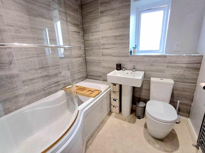 Low level WC, wash basin, panelled bath with shower over, part tiled walls, towel radiator, spot lighting, window to rear.