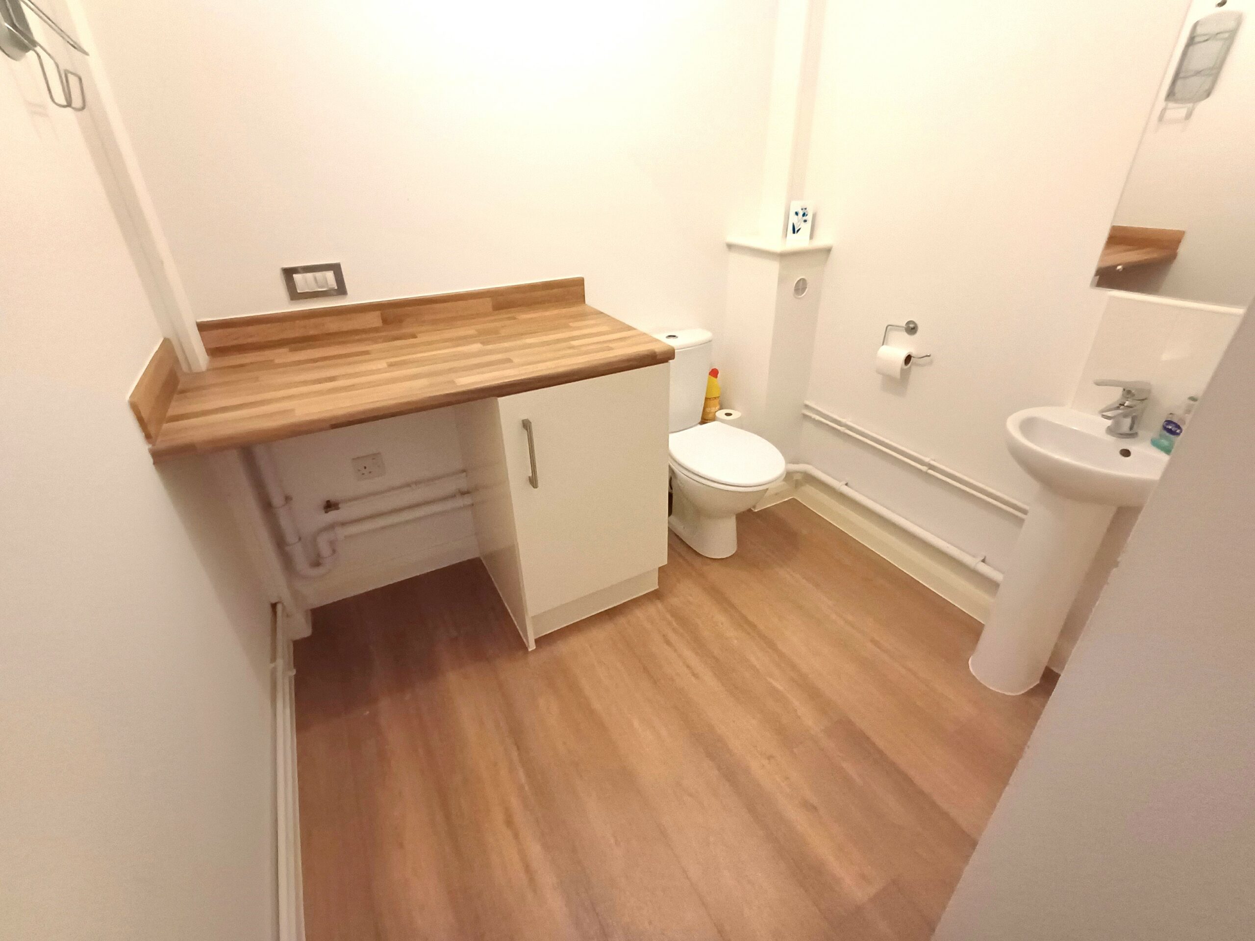 Low level WC, wash basin, space for washing machine, radiator.