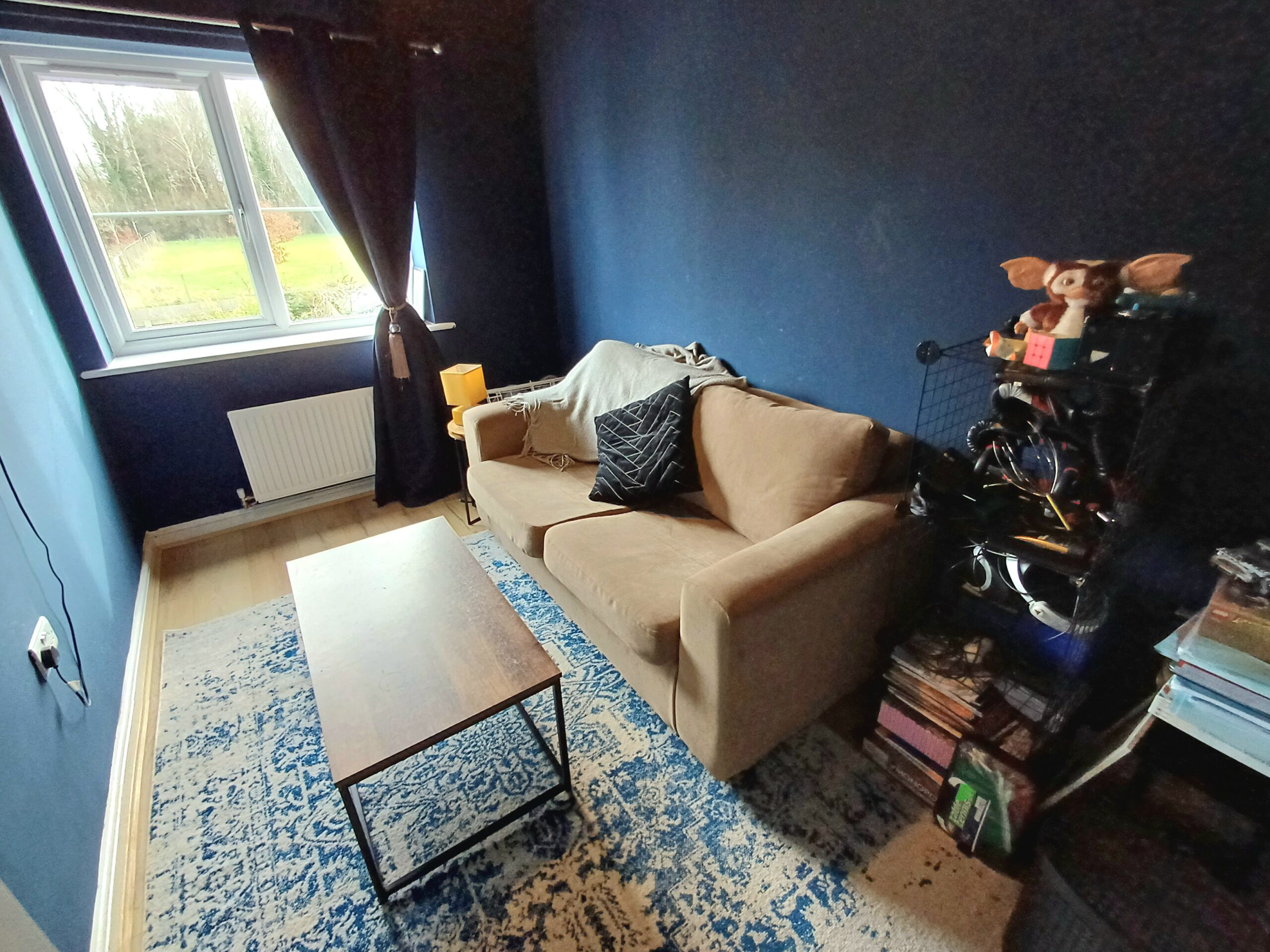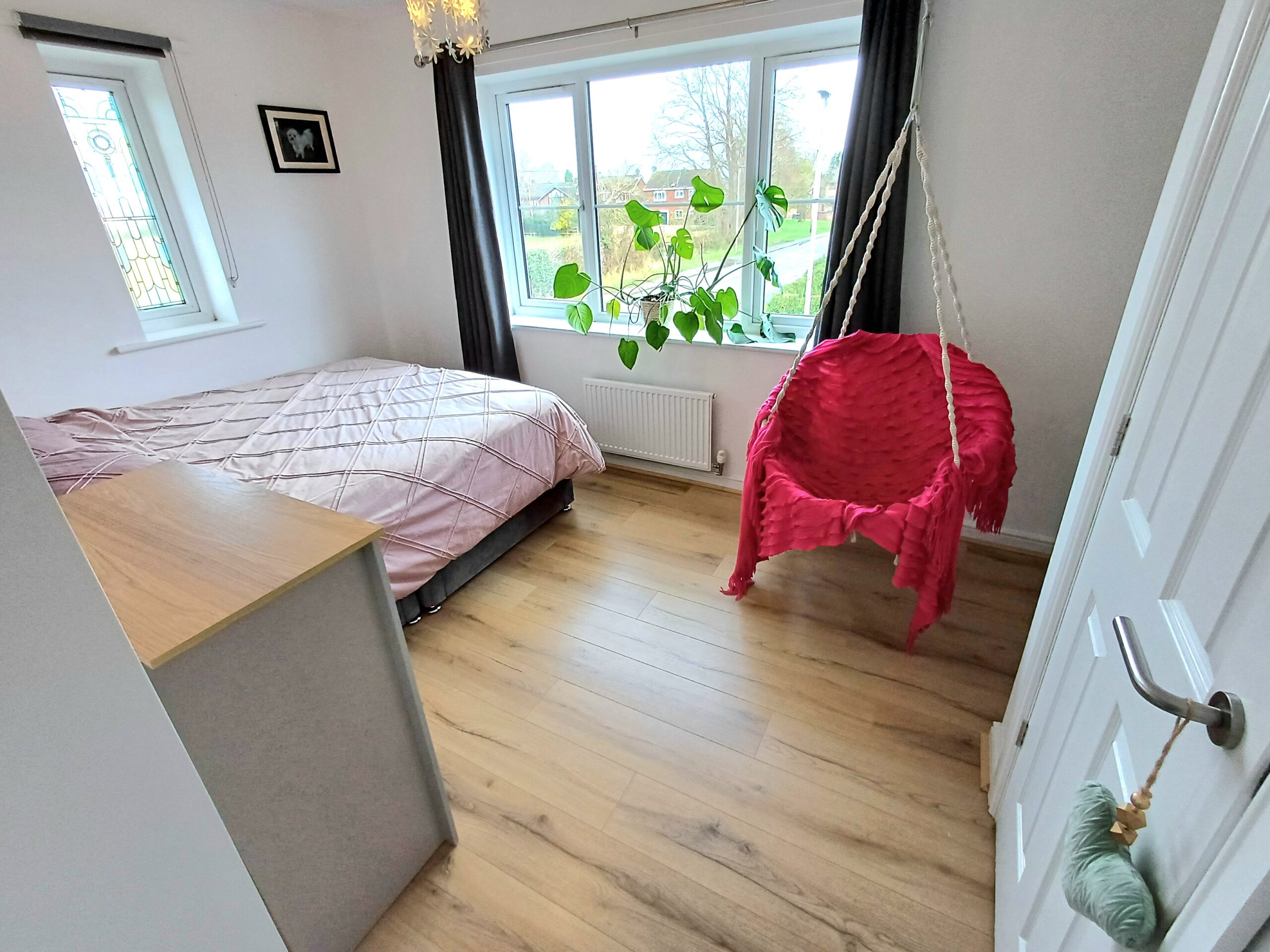 Radiator, wood effect flooring, window to front.