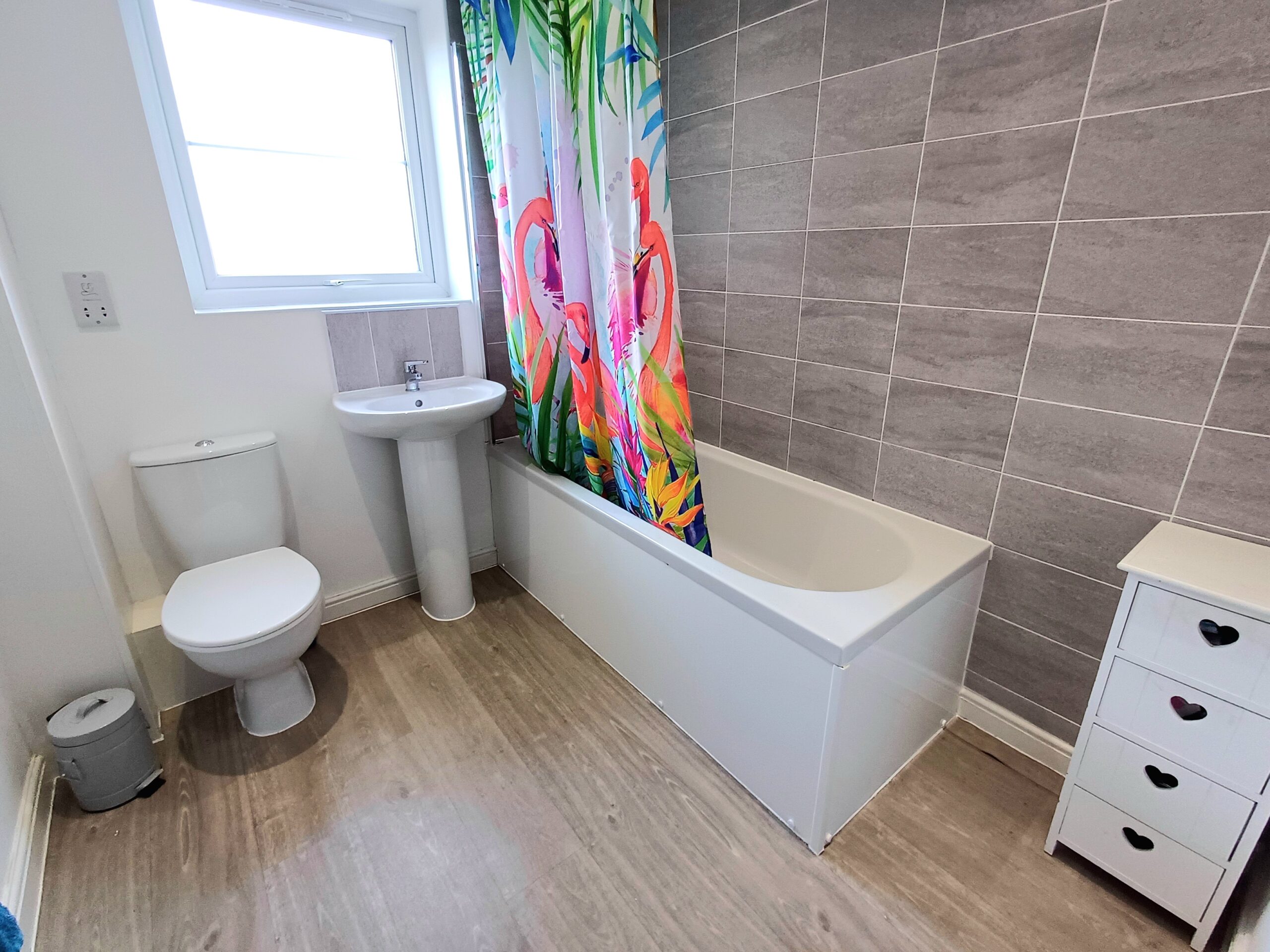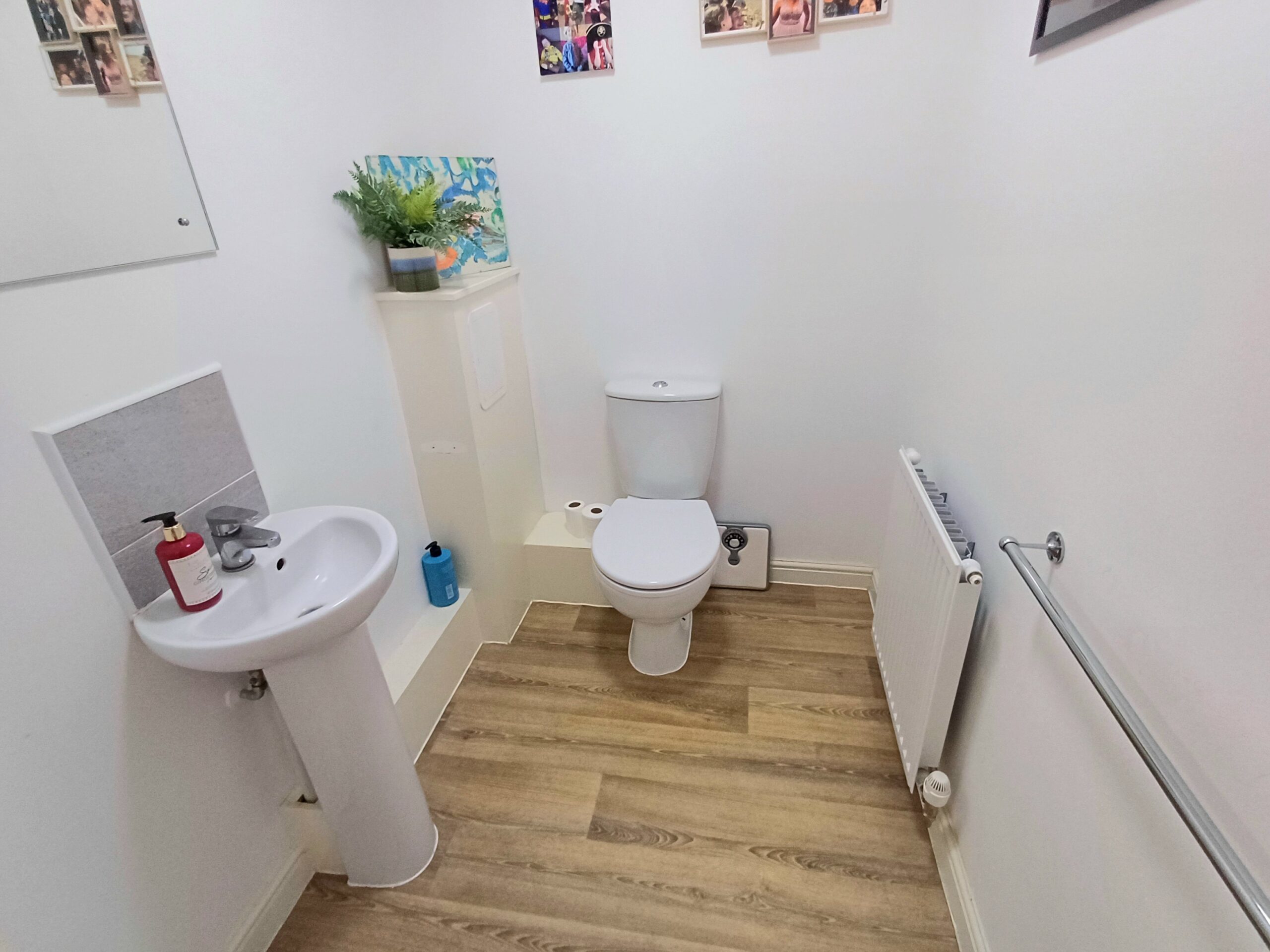 Low level WC, wash basin, radiator, wood effect flooring.