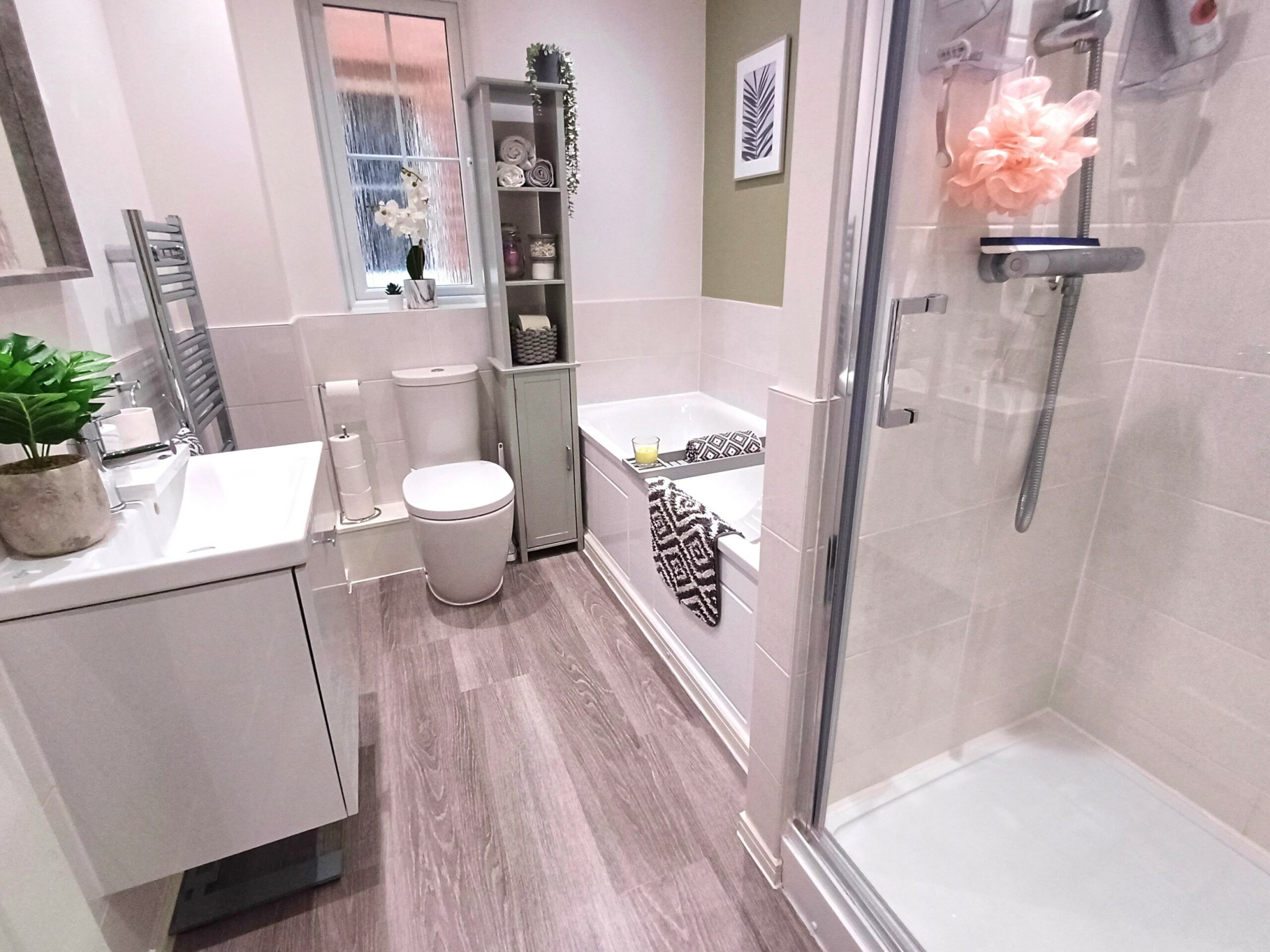 Suite comprises of a low level WC, wash basin, panelled bath, separate shower cubicle, towel radiator, part tiled walls, spot lighting, window to side.