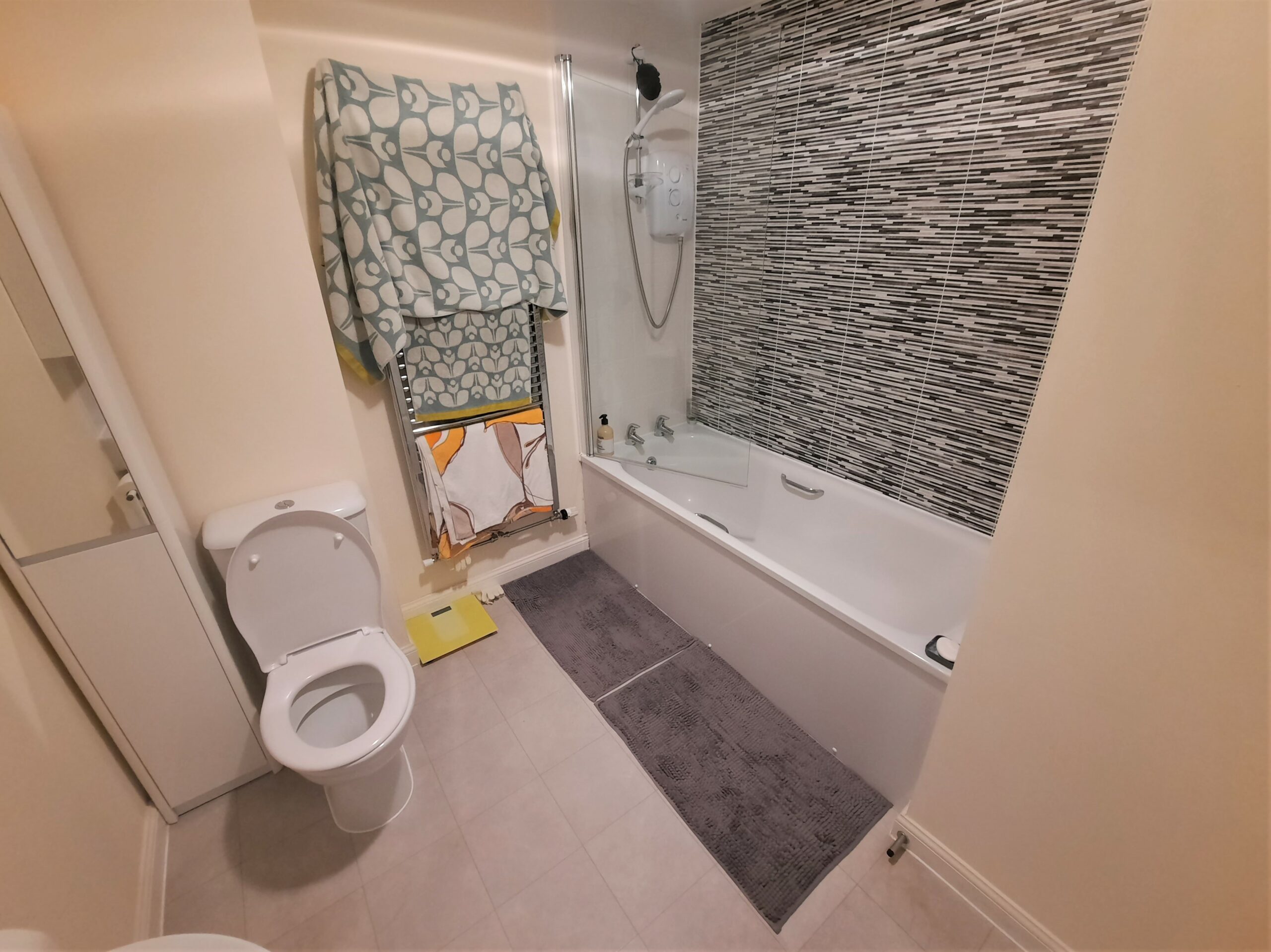 Suite comprising of a low level WC, wash basin, panelled bath with shower over, part tiled walls, radiator.