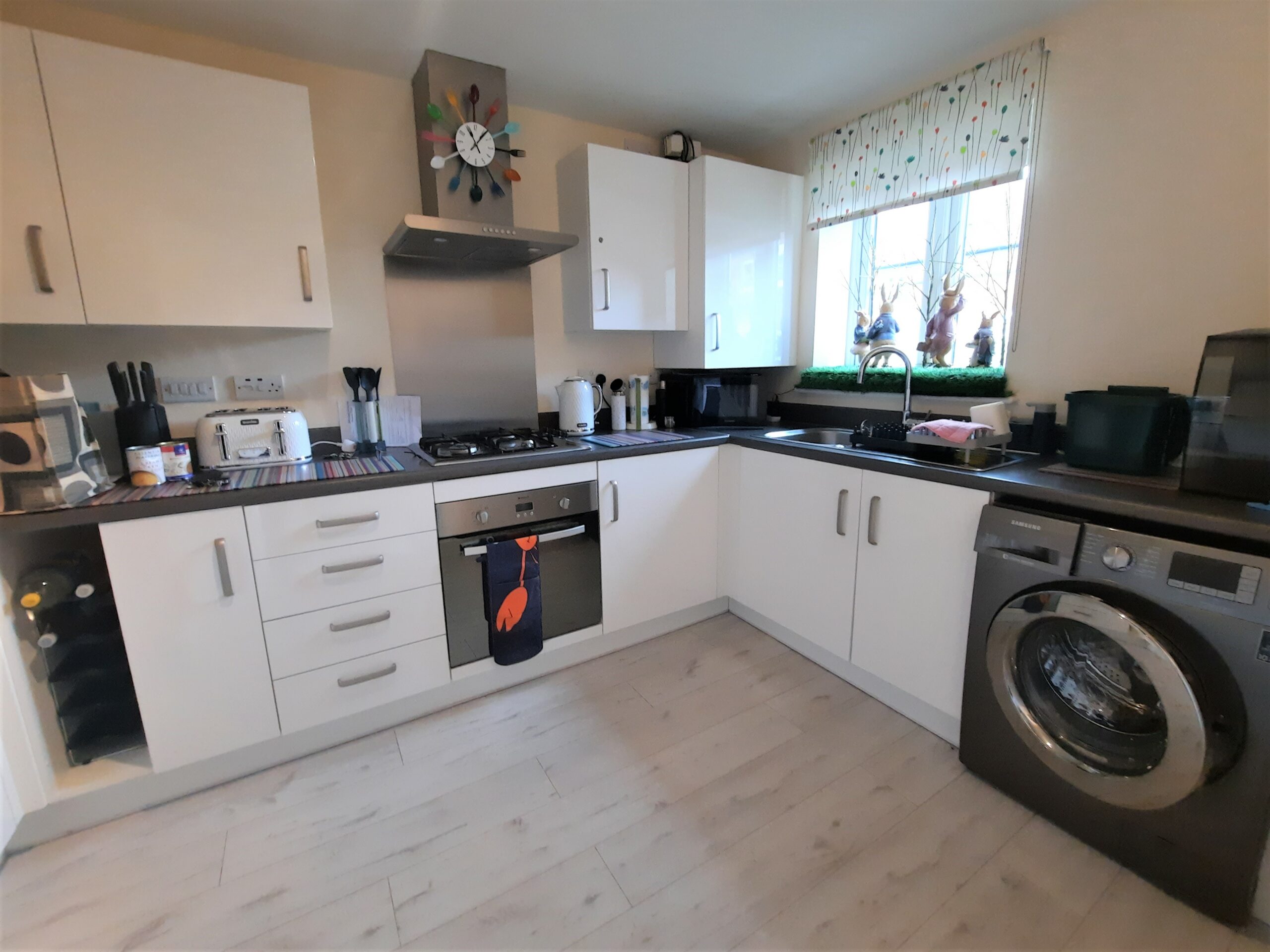 Fitted with a range of base and eye level units incorporating a sink and drainer, gas hob with extractor over, oven, space for fridge freezer and washing machine, radiator, window to front.