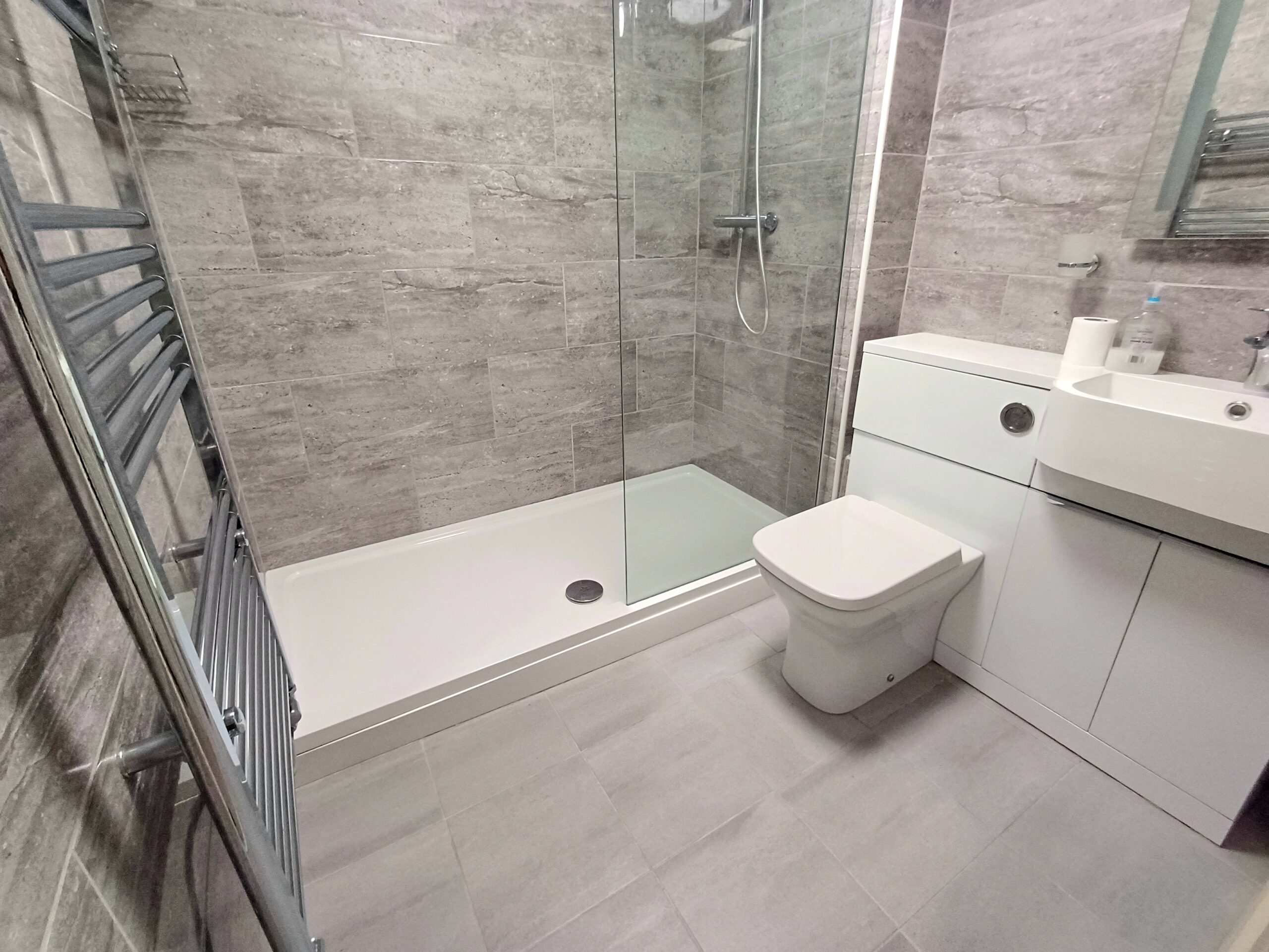 Modern shower room fitted with white suite comprising low level WC, wash hand basin and double walk in shower cubicle, tiled walls, towel radiator and extractor fan.