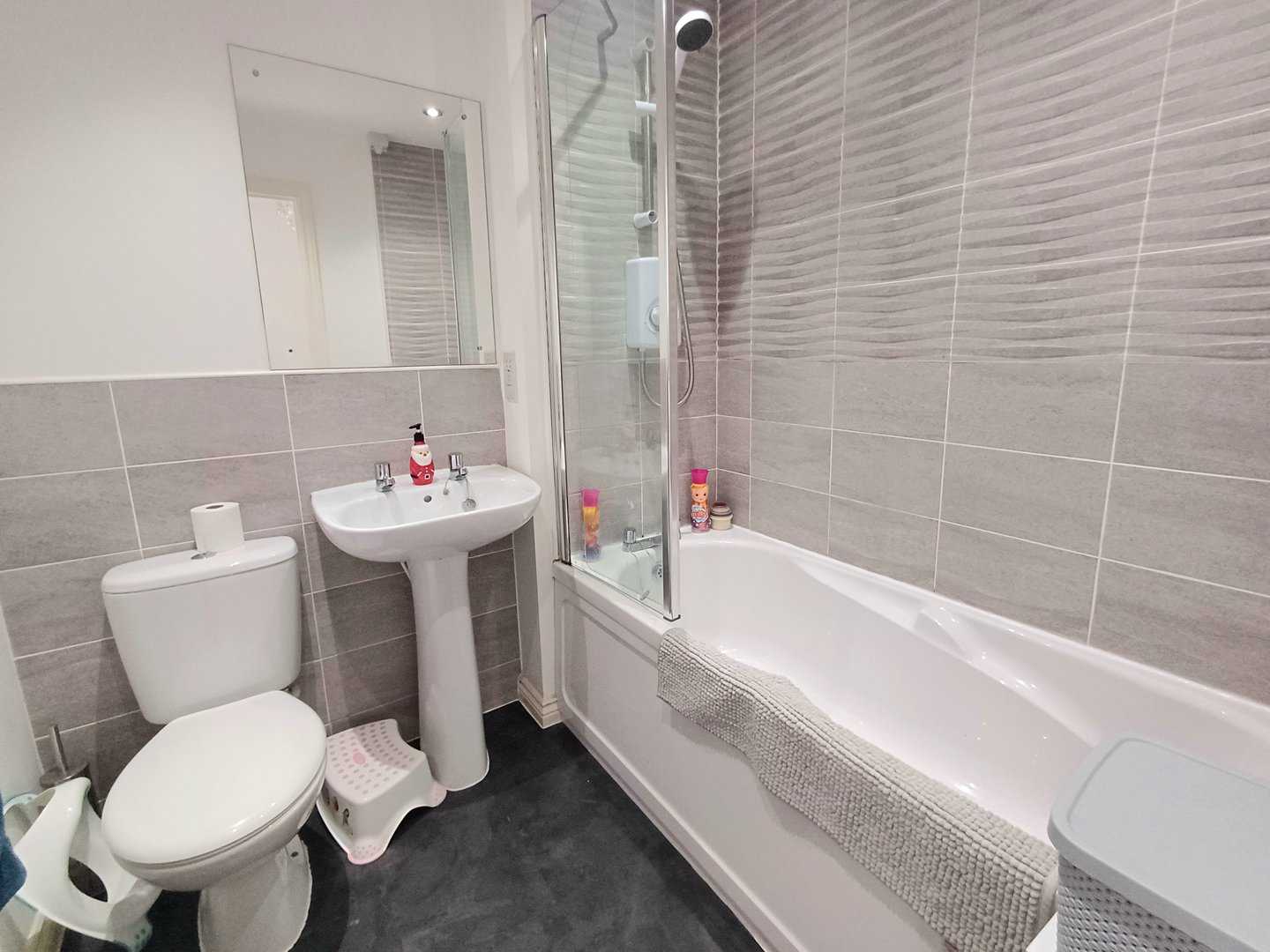 Low level WC, wash basin, panelled bath with shower over, towel radiator, part tiled walls, spot lighting.