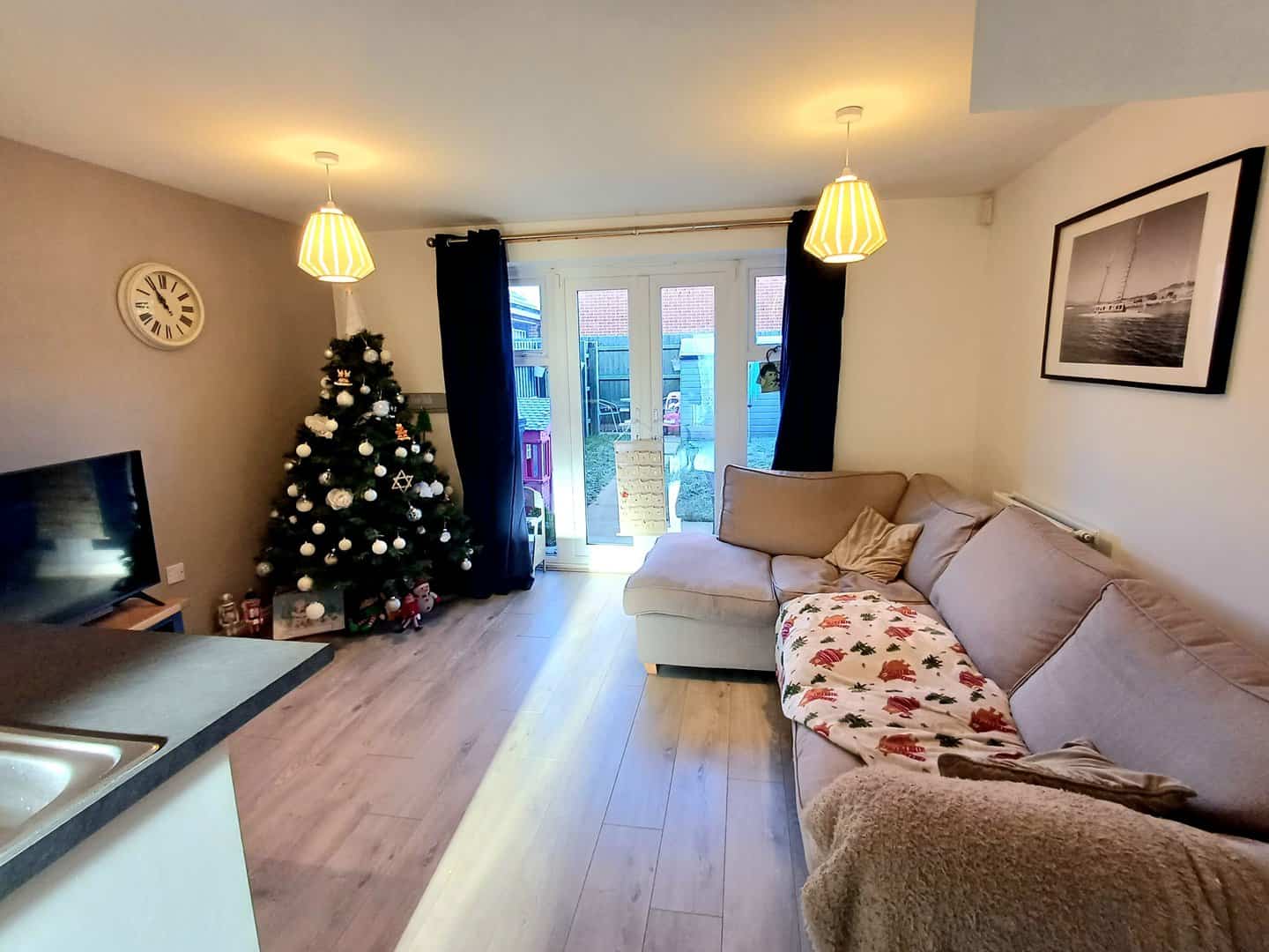 Laminate flooring, radiator, French doors to garden, stairs to first floor.