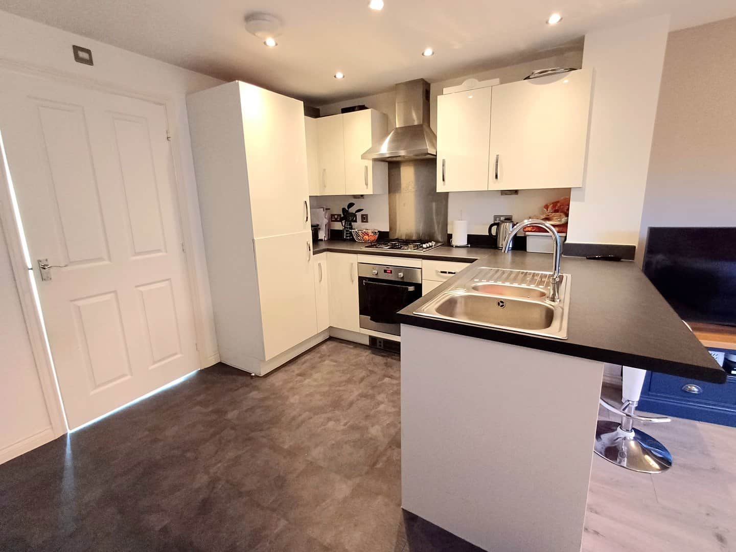 Range of base and eye level units incorporating a sink and drainer, gas hob with extractor over, oven, built in fridge freeze, spot lighting.