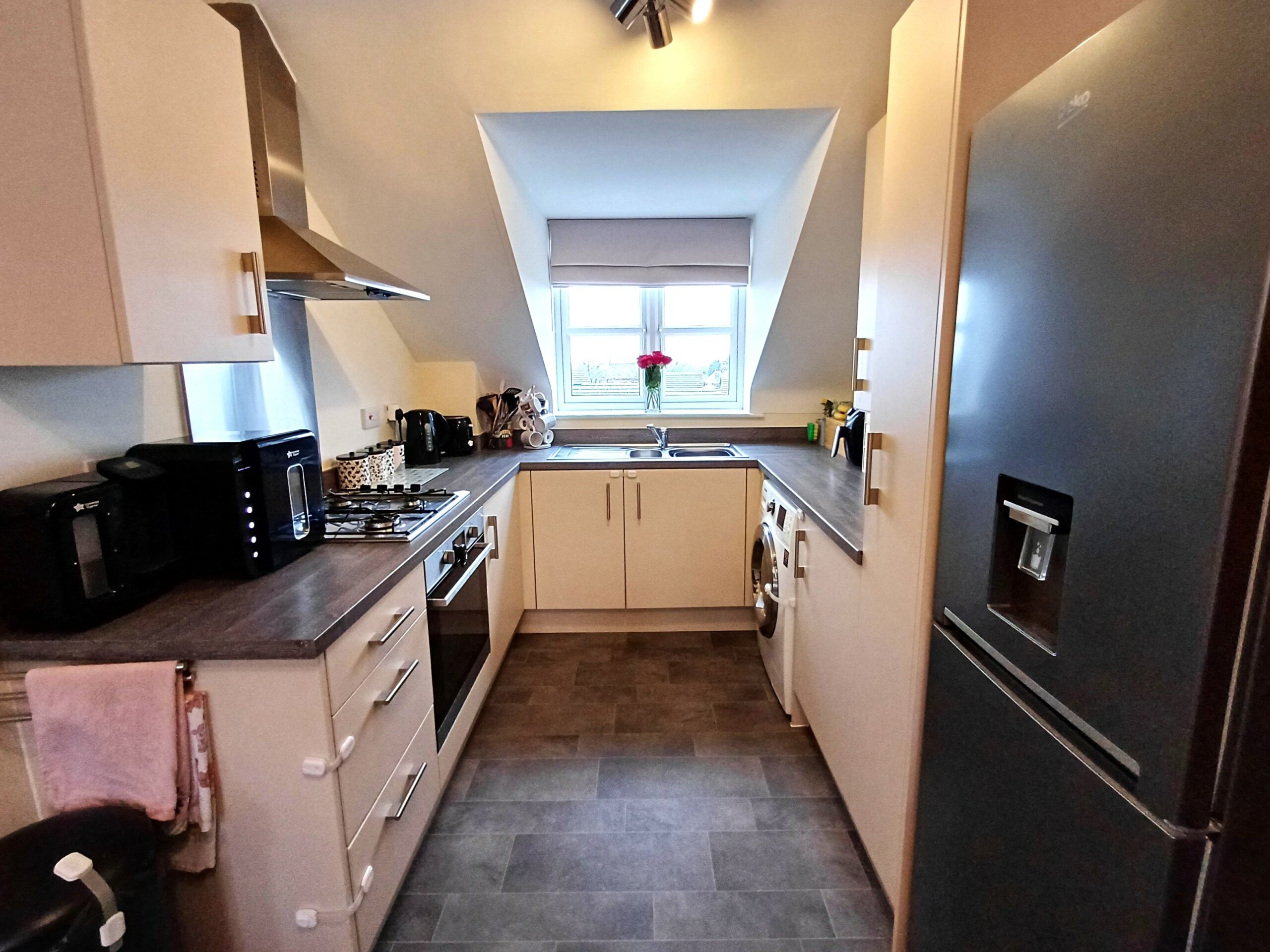 Fitted with a range of base and eye level units incorporating a sink and drainer, gas hob with extractor over, oven, space for washing machine and fridge freezer, window to rear.