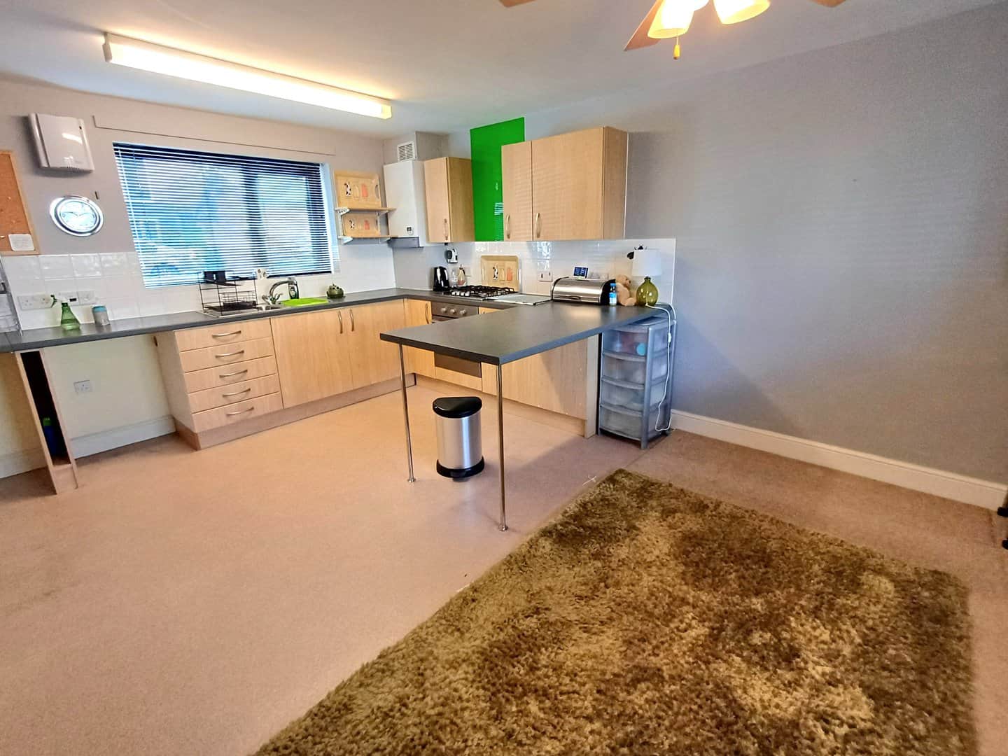 Large modern kitchen with breakfast bar and ample dining space. Fitted with matching range of wall cupboards, base units and drawers. Work surface housing one and a half bowl stainless steel sink unit and drainer with mixer tap, oven, four ring hob, space for fridge/freezer and washing machine, radiator, windows to front and rear.