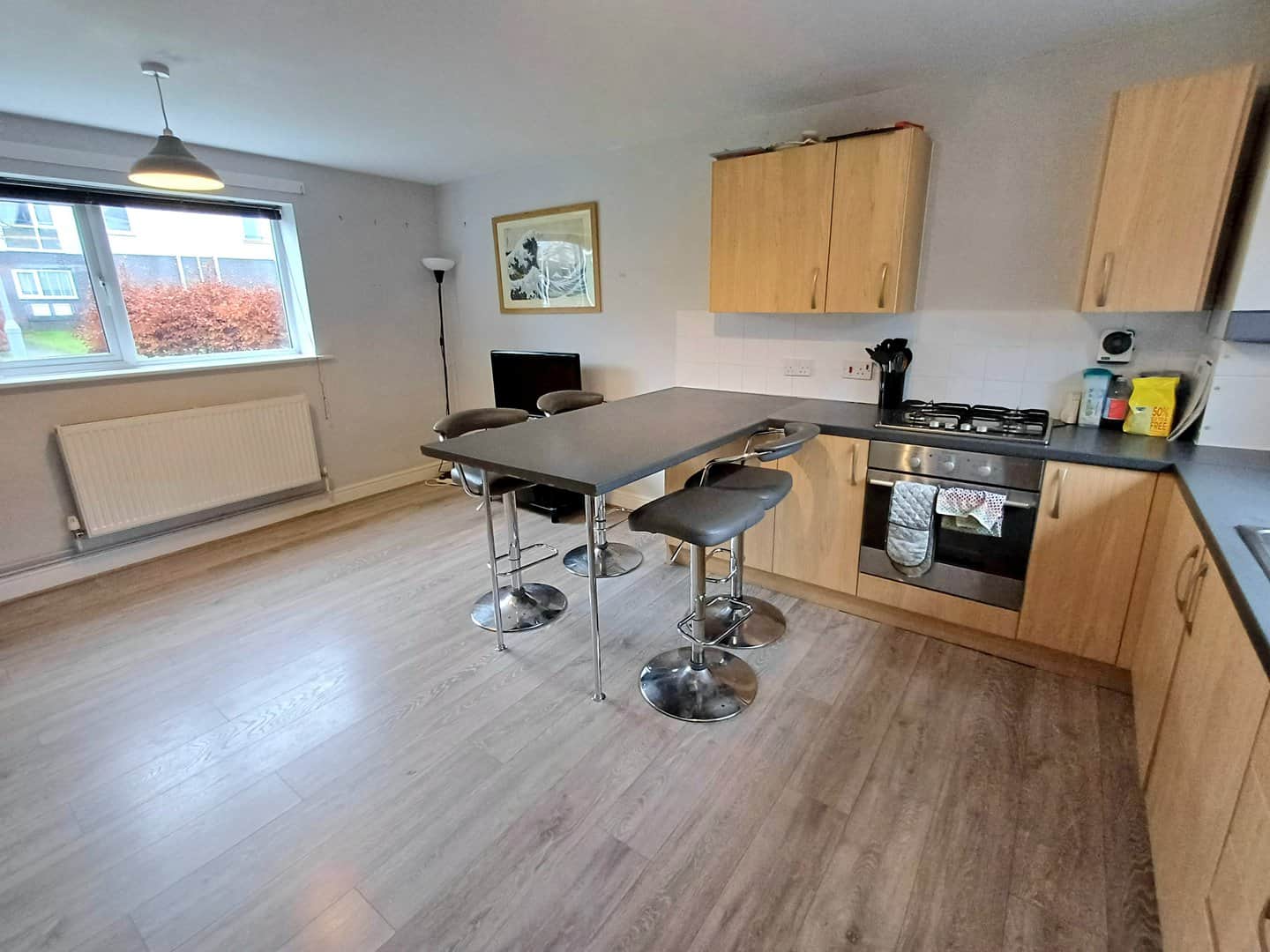 Fitted with a range of base and eye level units incorporating a sink and drainer, gas hob, oven breakfast bar, space for washing machine and fridge freezer, radiator, windows to front and rear.