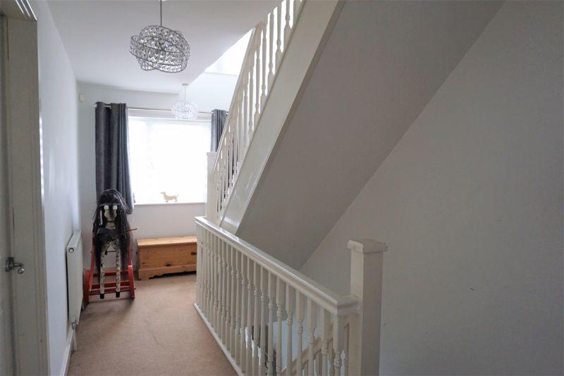 Entrance door leading into the hall, with wood effect flooring, double panel radiator, under stairs storage cupboard and a spindle staircase to the first floor.