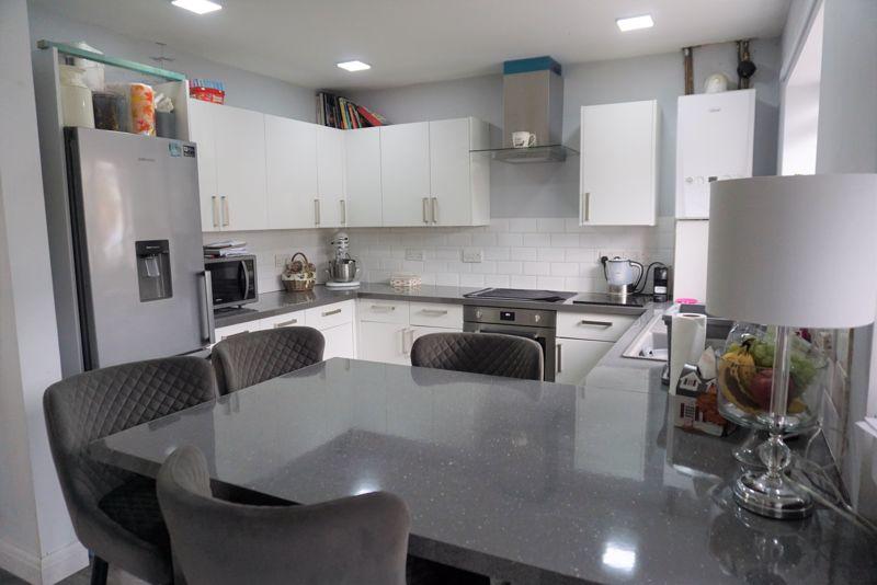 Matching high gloss wall and base units with chrome handles and under unit lighting, rolled over edge work surfaces, stainless steel bowl sink with drainer and mixer tap, integrated fridge freezer, electric oven, gas hob with stainless steel splash back, extractor fan and space for a washing machine, single panel radiator, double glazed window to the front.