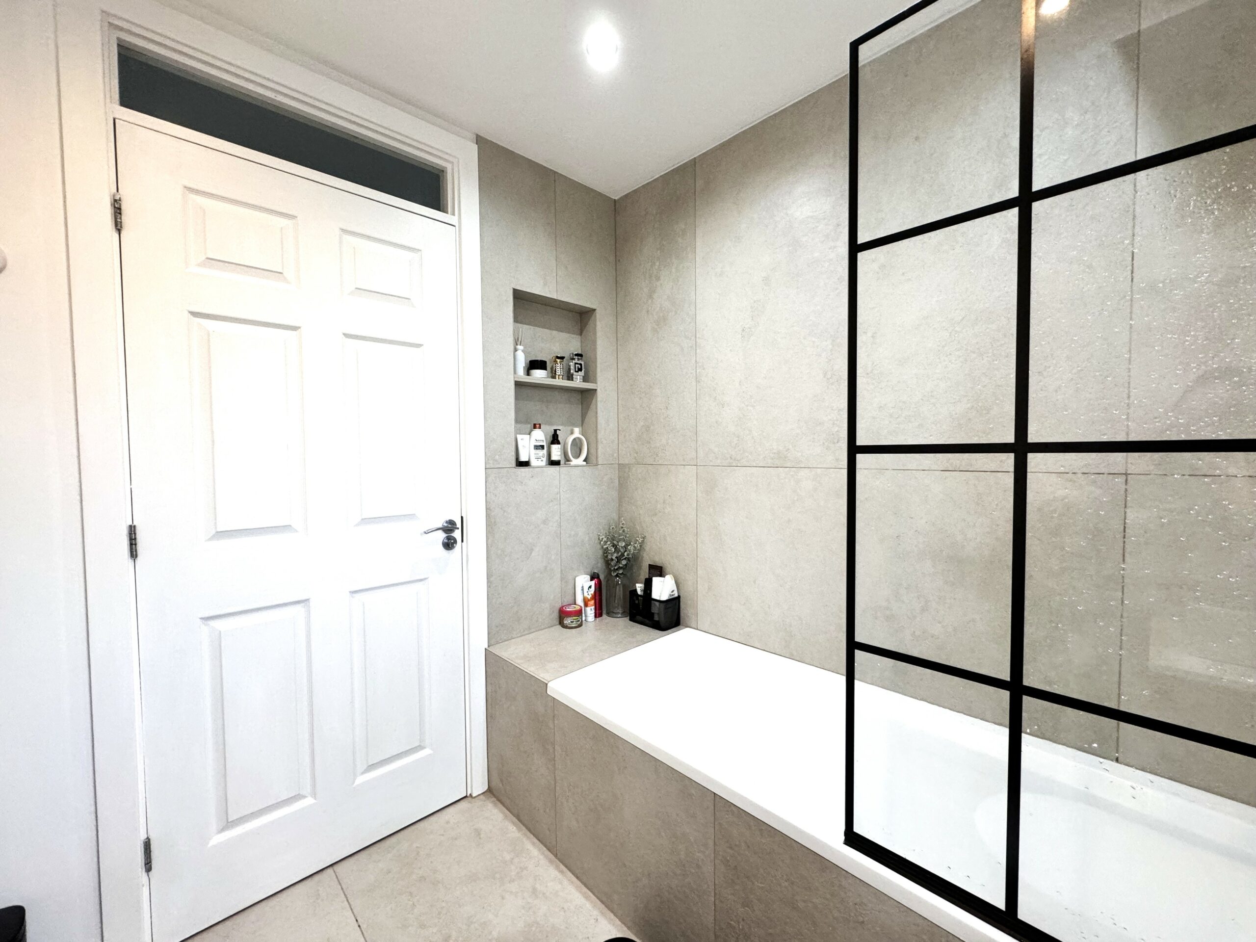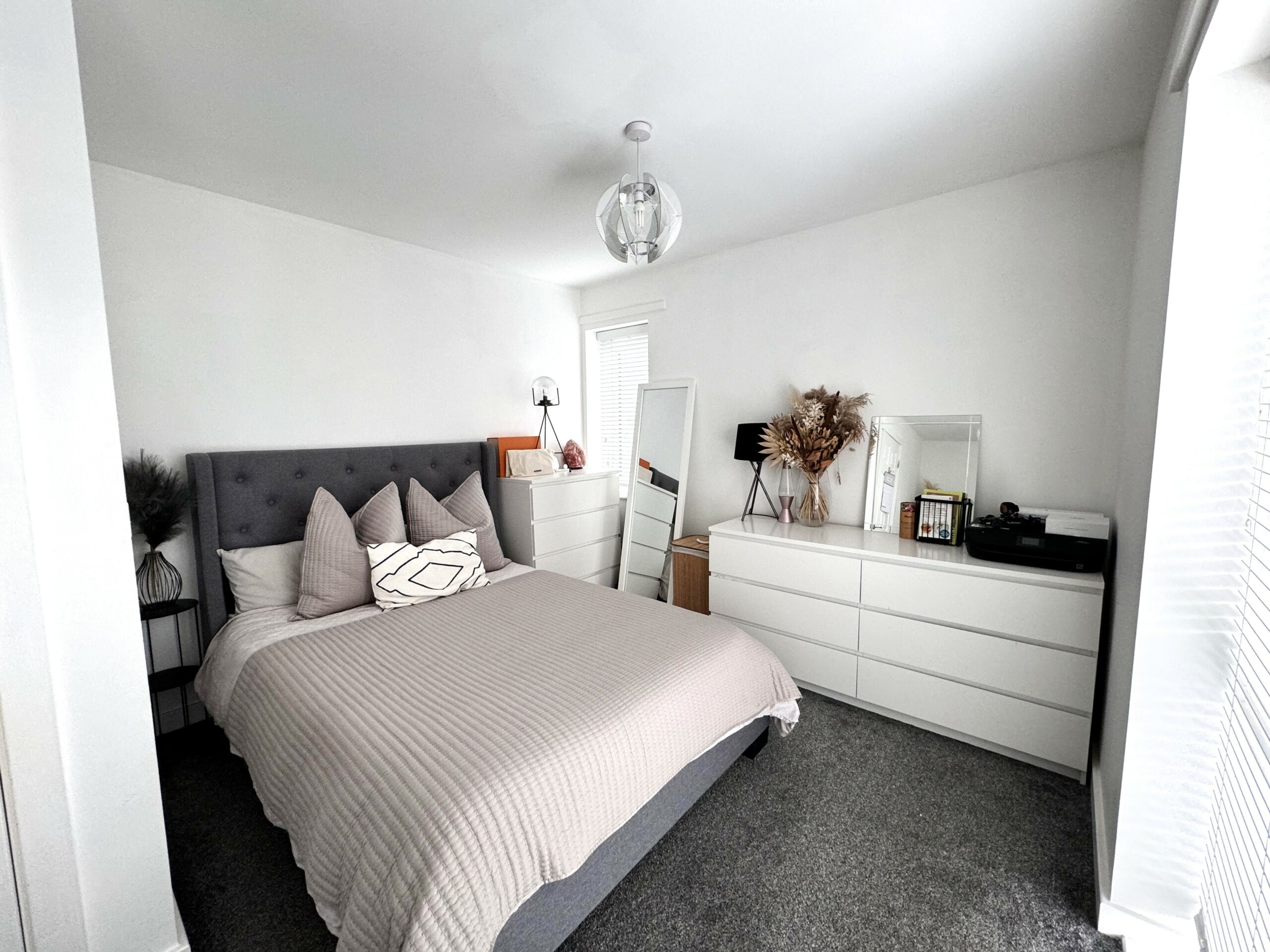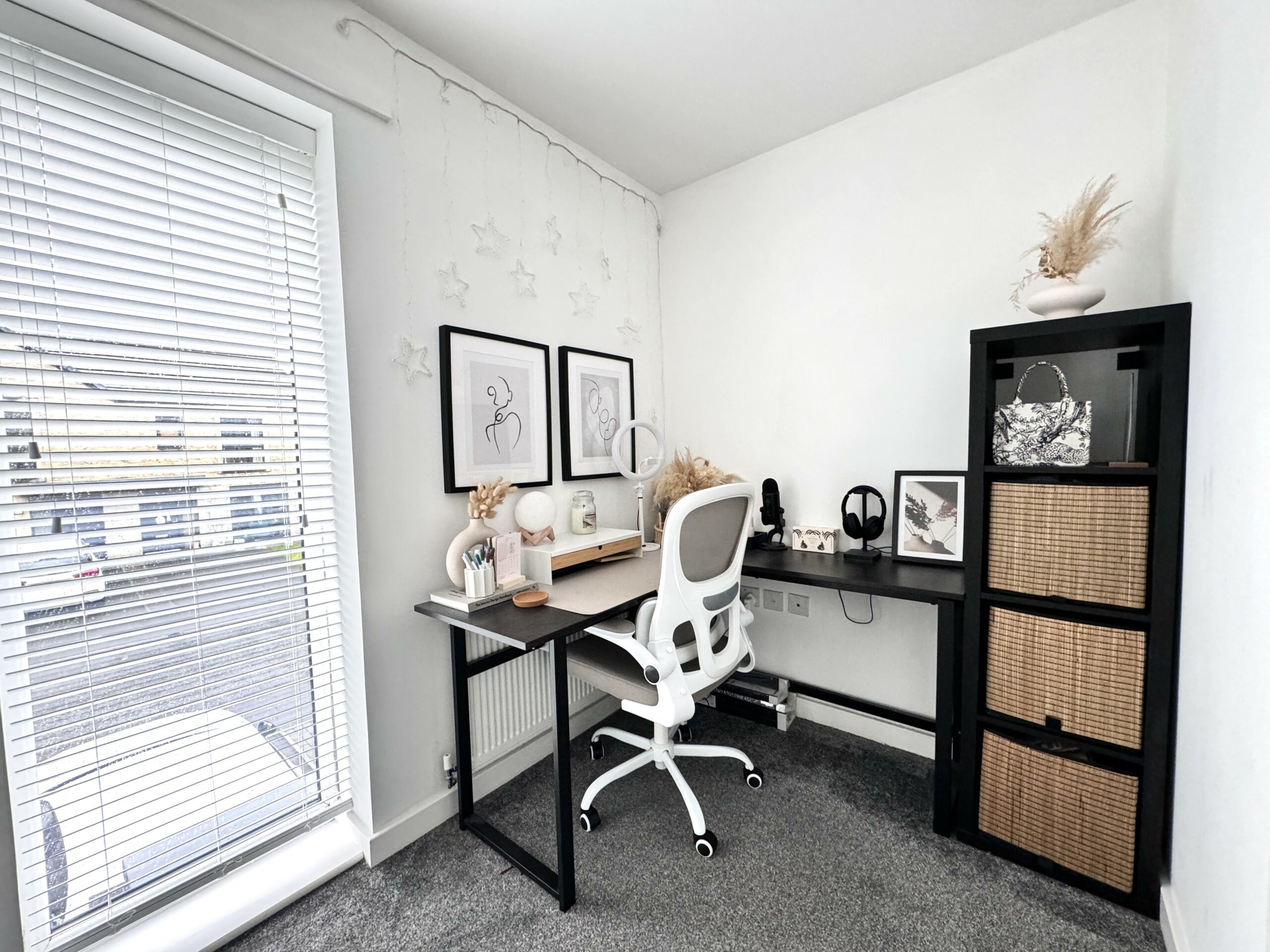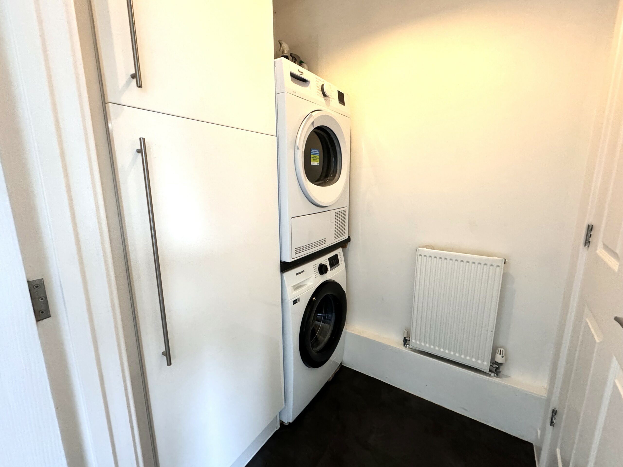 Radiator, wood effect flooring, storage cupboard, window to front and side.