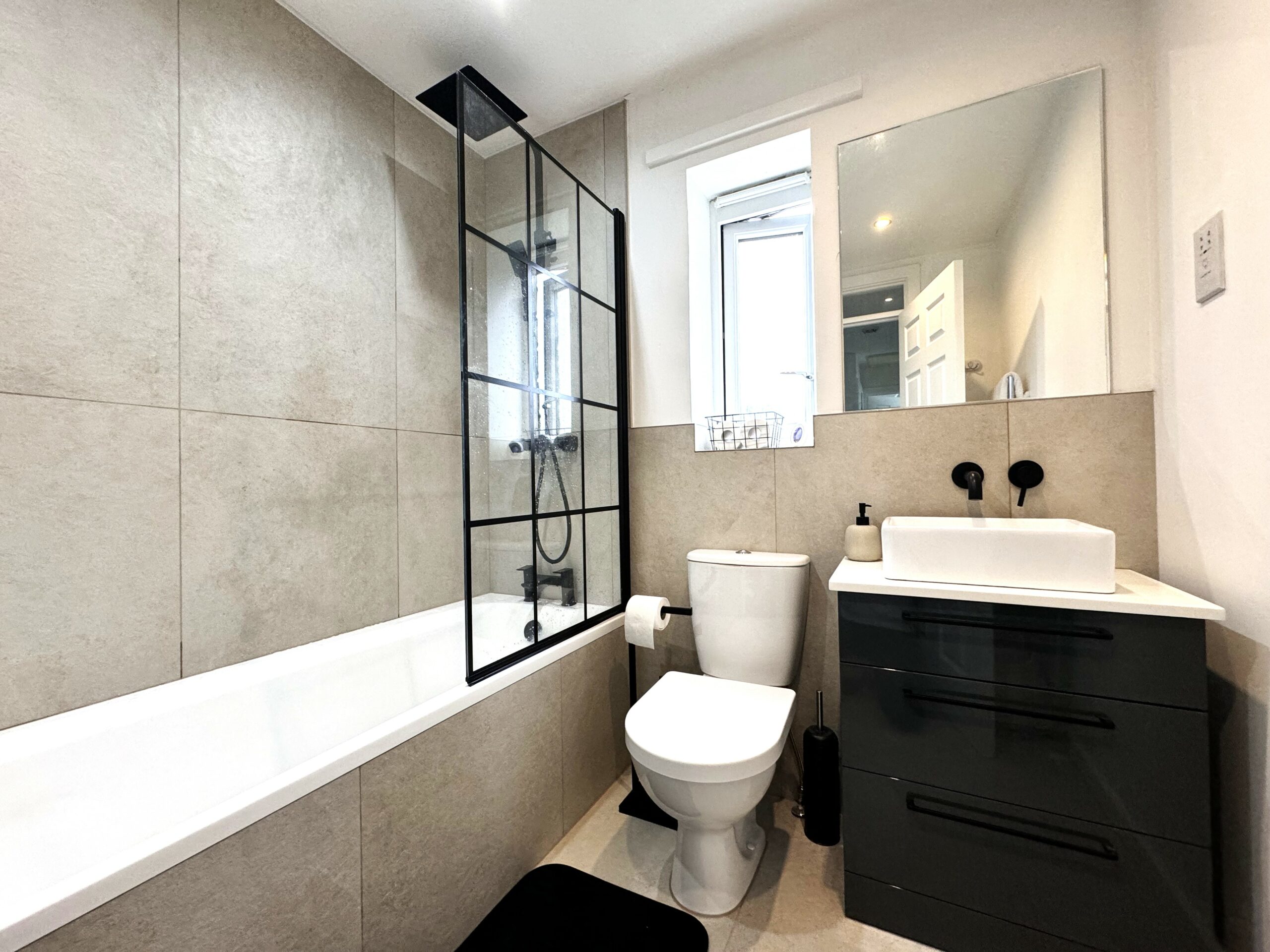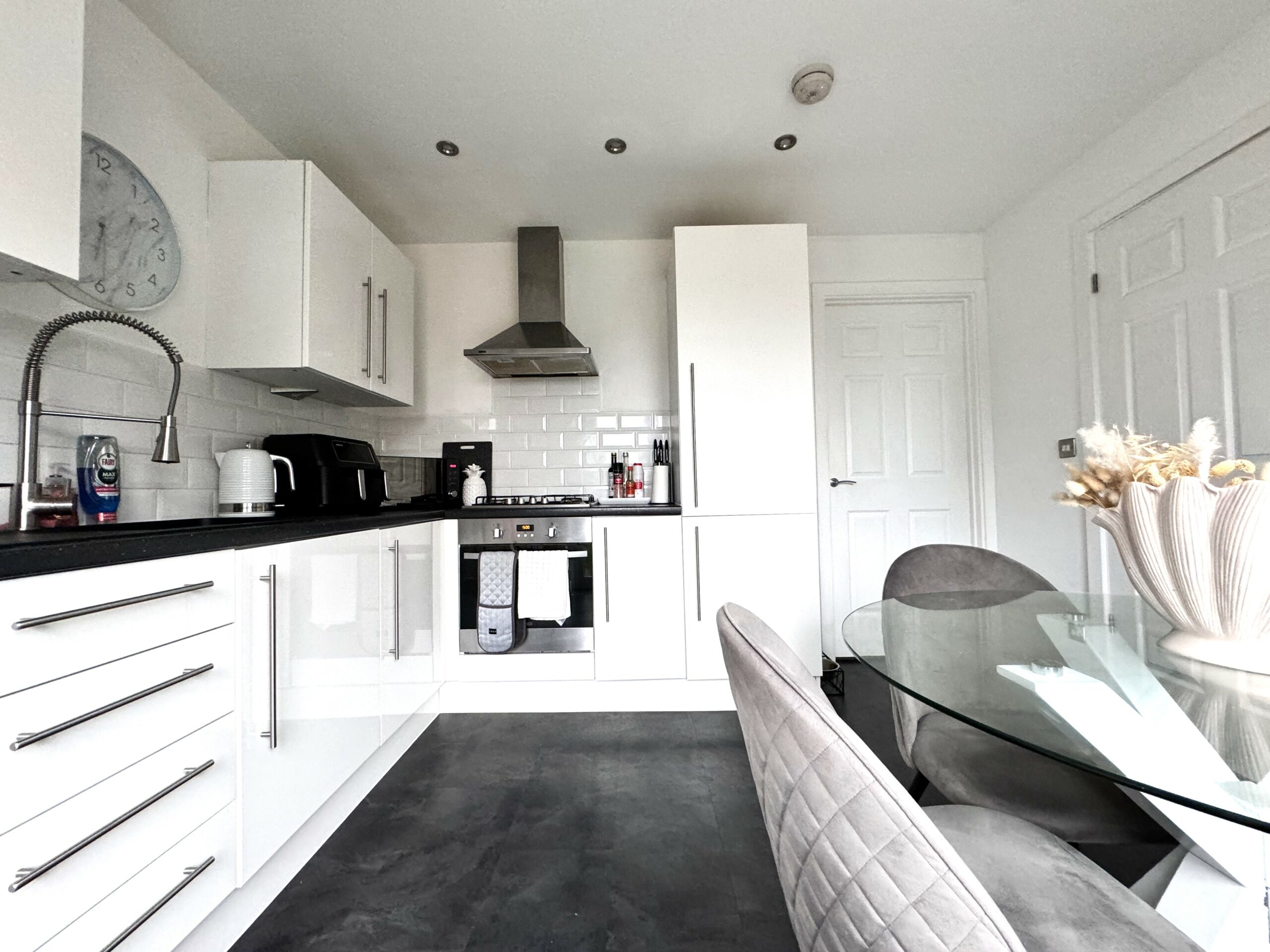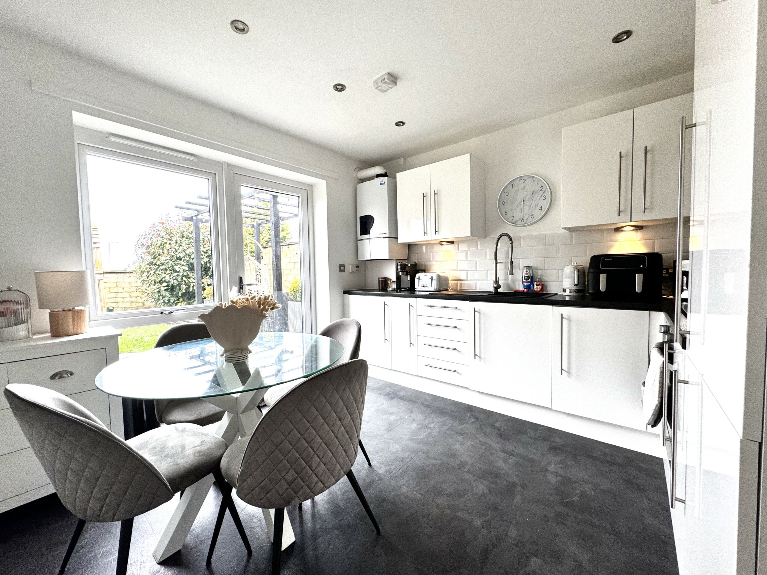 Fitted with a modern range of base and eye level units incorporating a sink and drainer, gas hob with extractor over, oven, built in fridge freezer, wood effect flooring, space for dining table, spot lighting, radiator, door to garden.